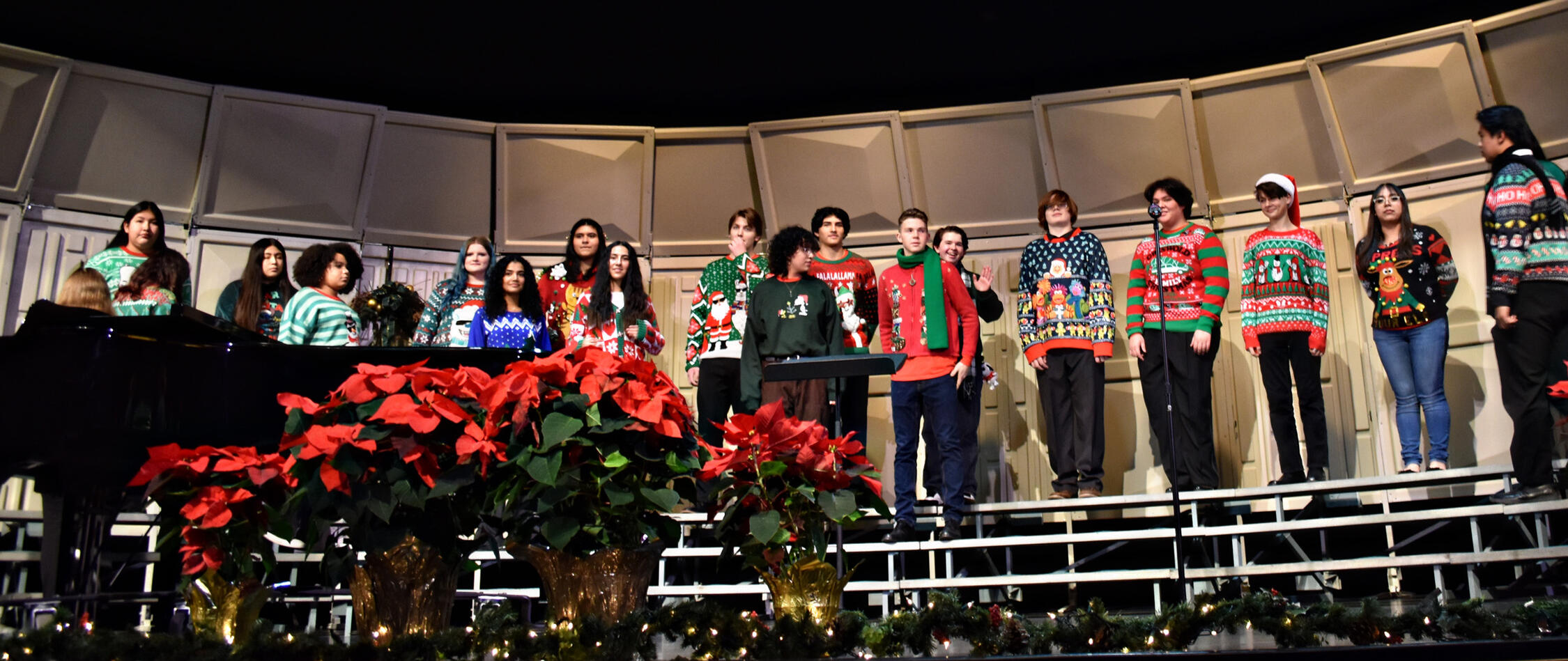 It was the week of music and holiday cheer, and West Chicago Community High School’s choir was the first to start the season with their annual holiday concert on Dec. 12. under the direction of music teacher Brandon Fantozzi. The concert, mixed and chamber choirs, as well as the Leman Middle School eighth grade choir, treated audiences to festive tunes during the hour-long program in Weyrauch Auditorium.The concert featured traditional Christmas, Hanukkah, and Latin music, including "It’s Beginning to Look Like Christmas", "Veni Veni Emmanuel", and "Eight Days of Lights"."The songs show the diversity, and not being stuck in just one culture, and obviously just embracing other cultures, other holidays and not just the same ones," junior Adamary Vega said.Unlike other concerts this year, the performers did not wear the traditional robe and dress, but instead opted out for ugly Christmas sweaters and scarves. Many of the sweaters featured Fantozzi's face in a tribute to the music teacher known as "Fan".Like other choir concerts, there are two songs that split the performers up by vocascarvese: higher voices (altos and sopranos) sang "The First Noel", and lower voices (basses, tenors, and baritones) performed "We Need a Little Christmas".The evening ushered in performances by Leman's choir as well, who sang two songs."Music brings people together. It sounds corny, but it's true," junior Ismael Trinidad said.Fantozzi dedicated a portion of time to honor the five students who qualified for the Illinois Music Education Association (ILMEA), including sophomore Milly Mora-Zarco, senior Cora Garling, sophomore Nick Riconoscuto, sophomore Gwen Nika, and senior Francis Moffatt, all who performed at the district concert in early November.Mora-Zarco made it into ILMEA State, which will require him to travel to Peoria to sing among the best singers in Illinois.